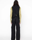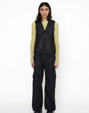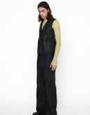 LONG BLACK GILET WITH BUTTON CLOSURE, BACK SLIT, 2 CHEST POCKETS AND LEATHER LOGO PATCH. THIS ITEM HAS BEEN MADE AT OUR SELECTED SUPPLIER IN VENETO, ITALY.