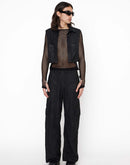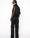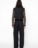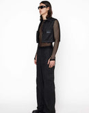 CROP BLACK VEST WITH BUTTON CLOSURE, 2 CHEST POCKETS AND LEATHER LOGO PATCH. THIS ITEM HAS BEEN MADE AT OUR SELECTED SUPPLIER IN VENETO, ITALY.