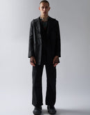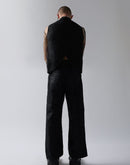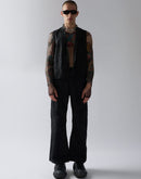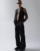 Long black vest with button closure, back slit, 2 chest pockets and leather logo patch.