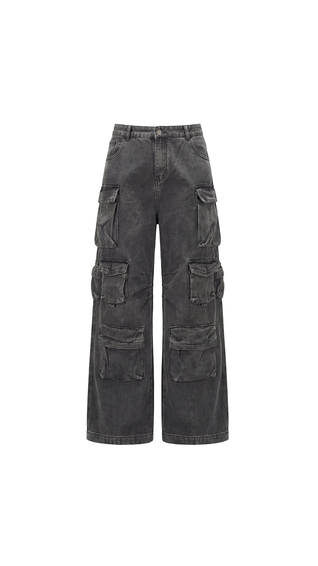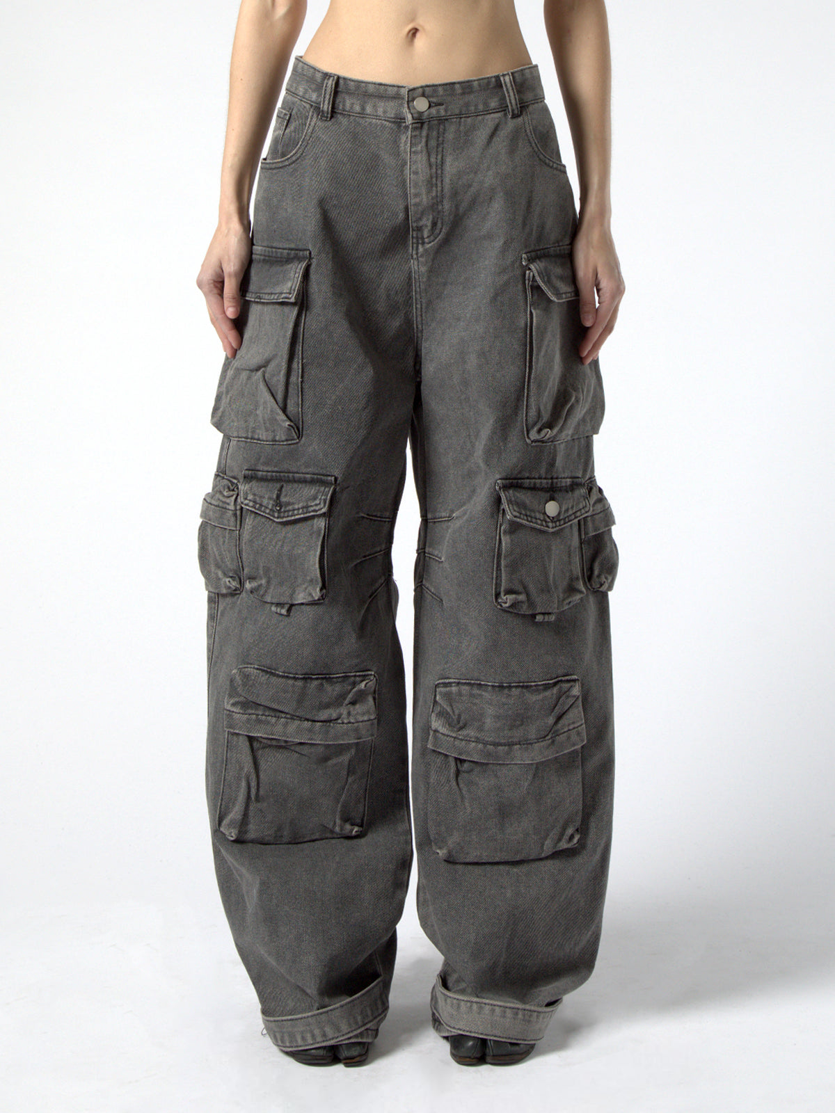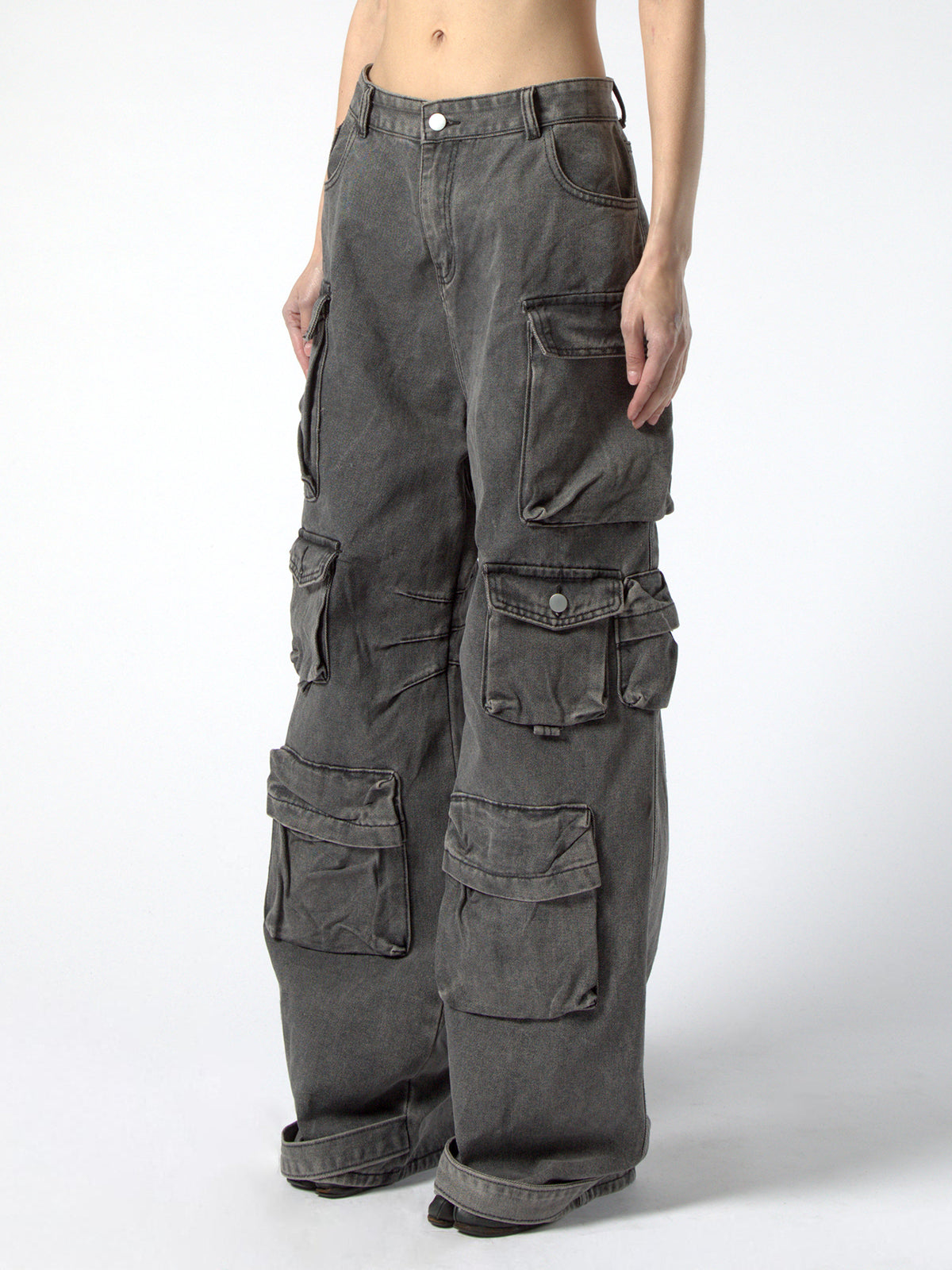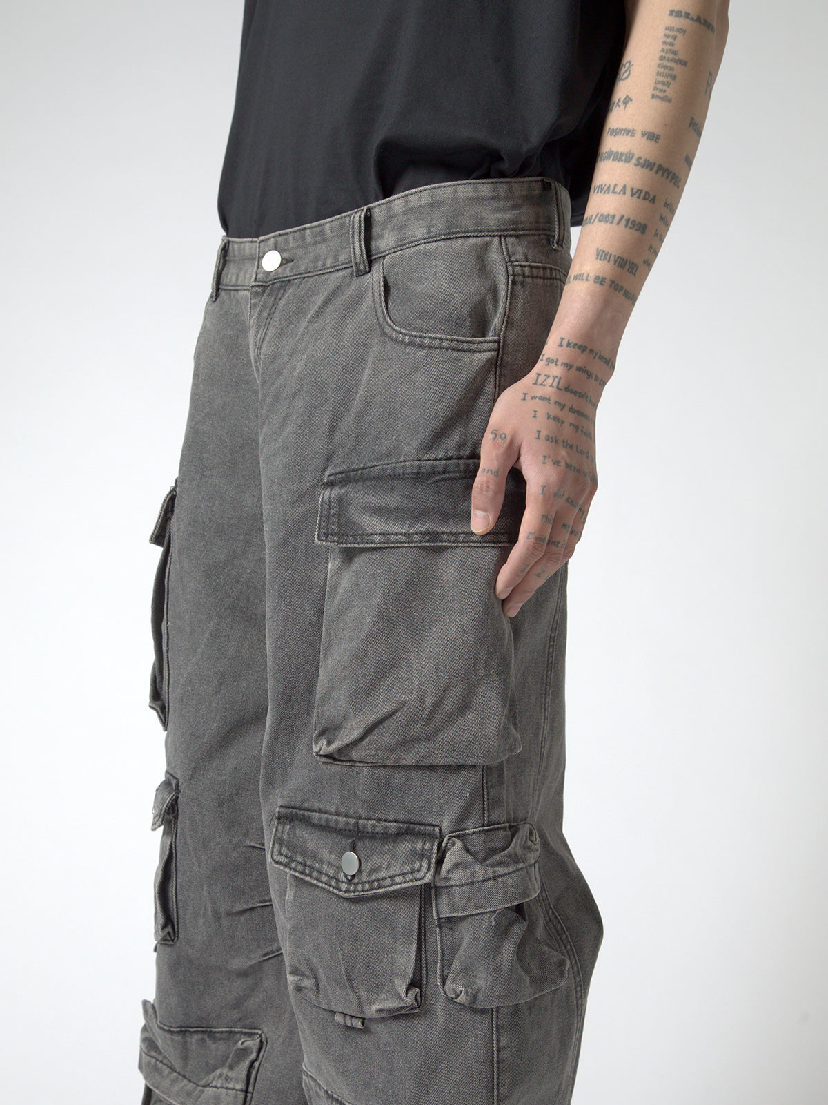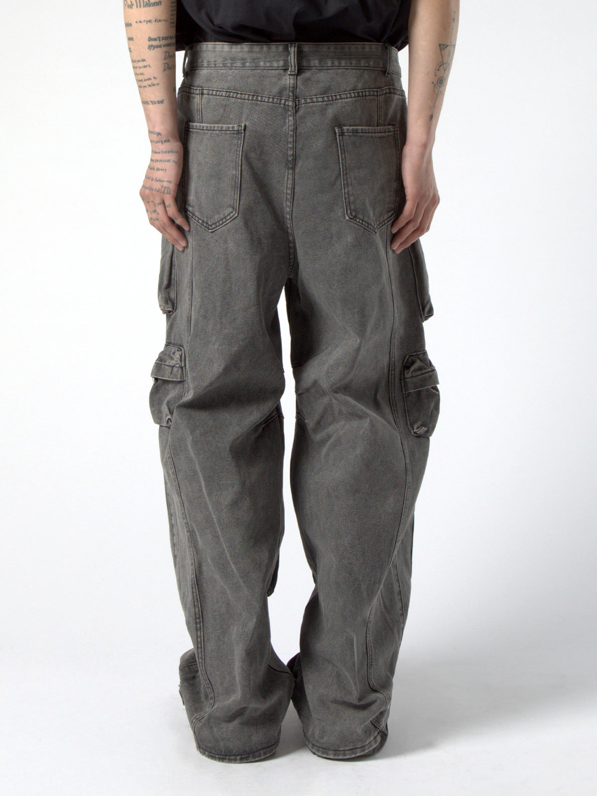 Cargo denim pants with multiple applied pockets and waxed dermatex treatment, enhancing