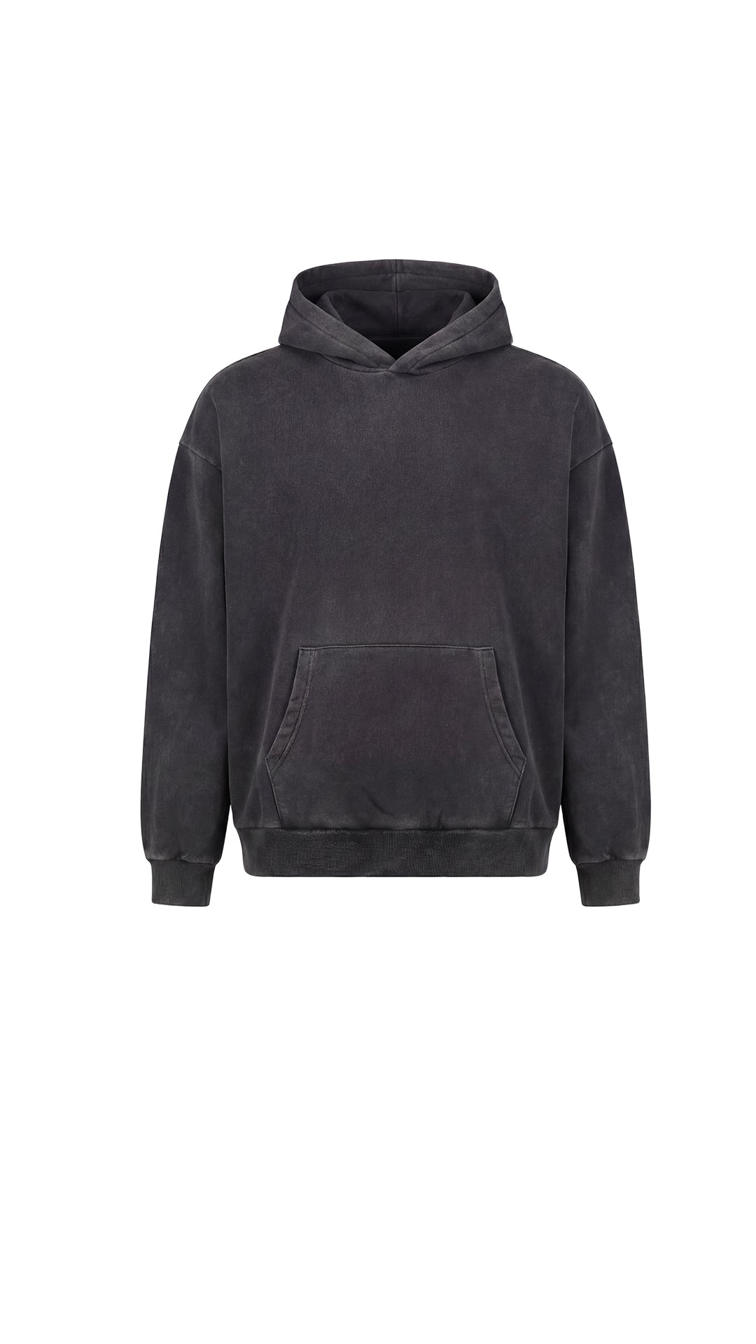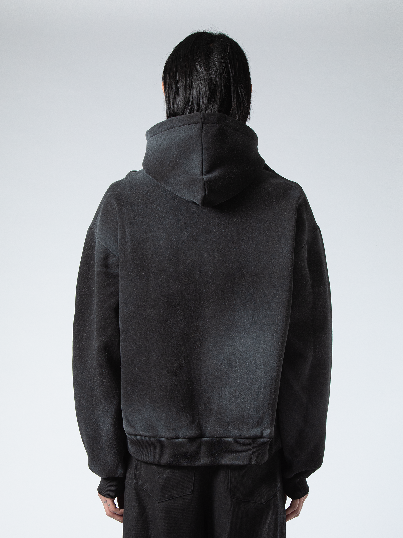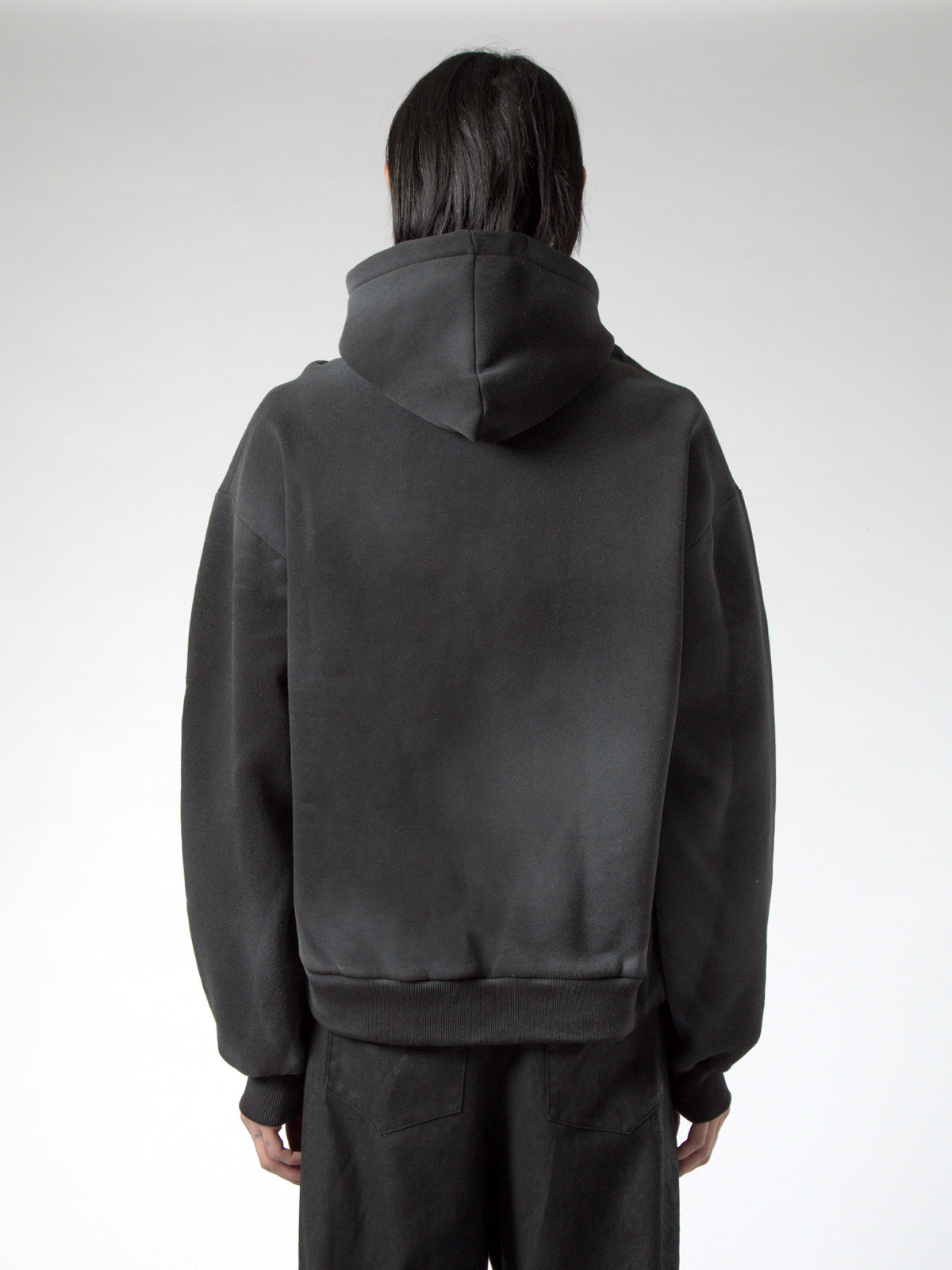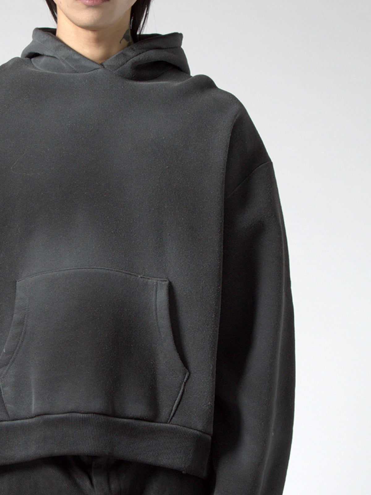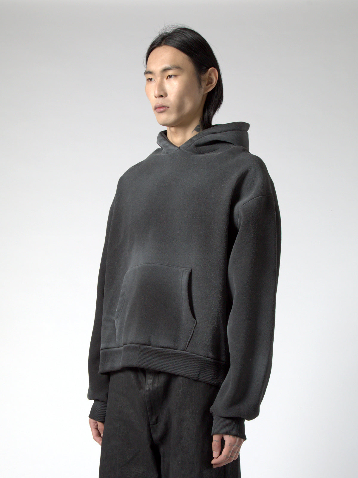 An oversized hooded sweatshirt with clean construction and waxed dermatex surface treatment for