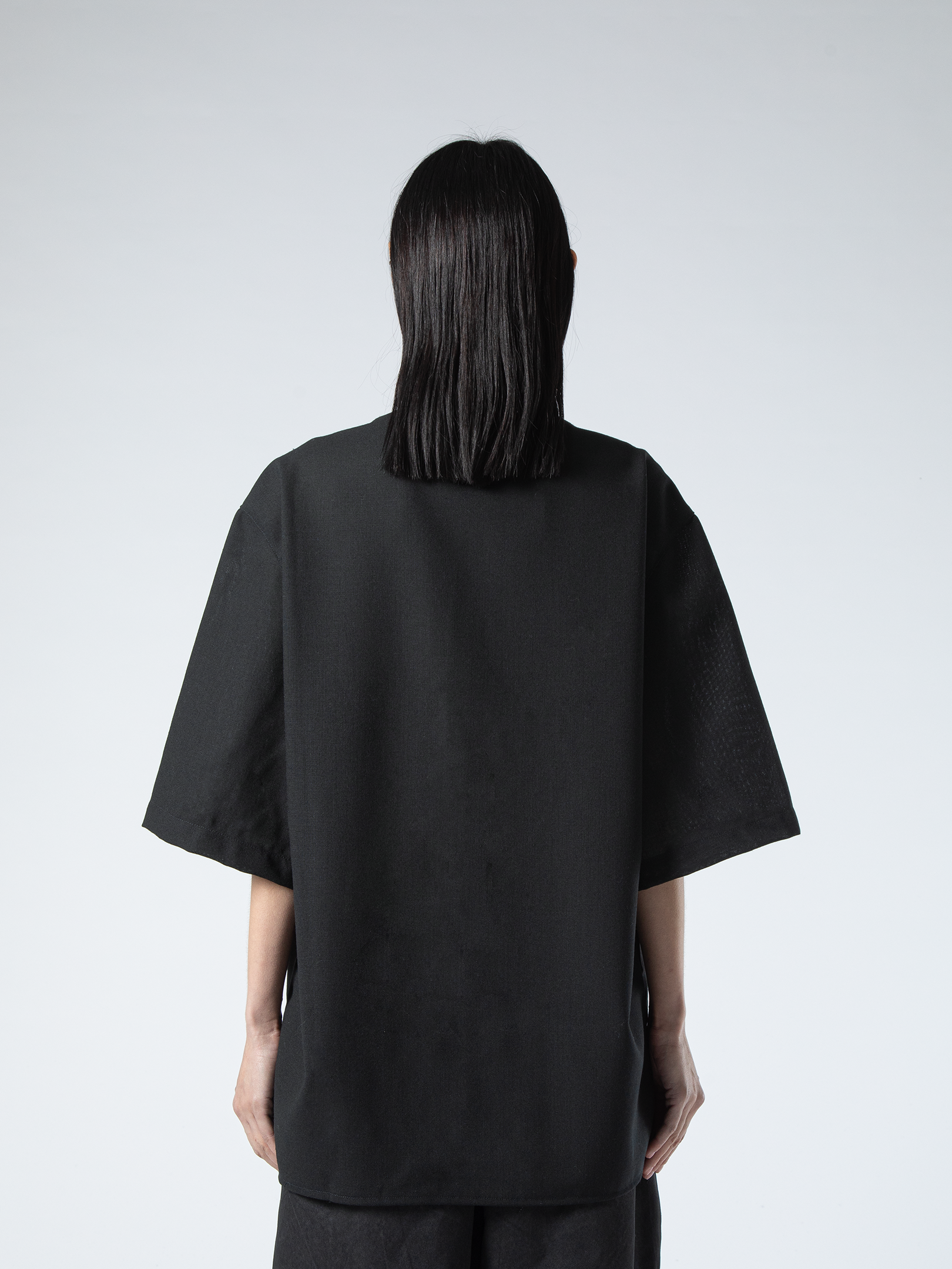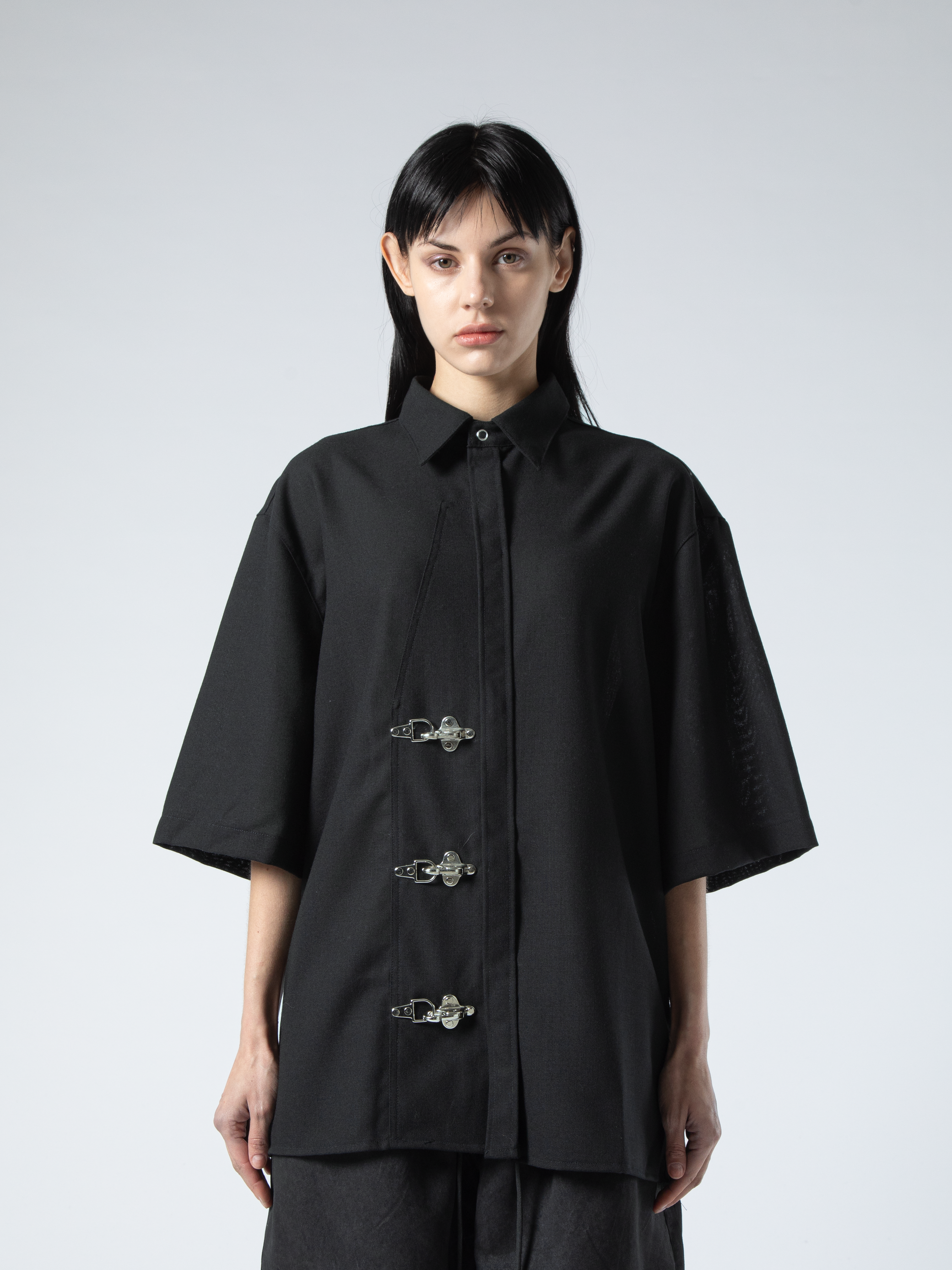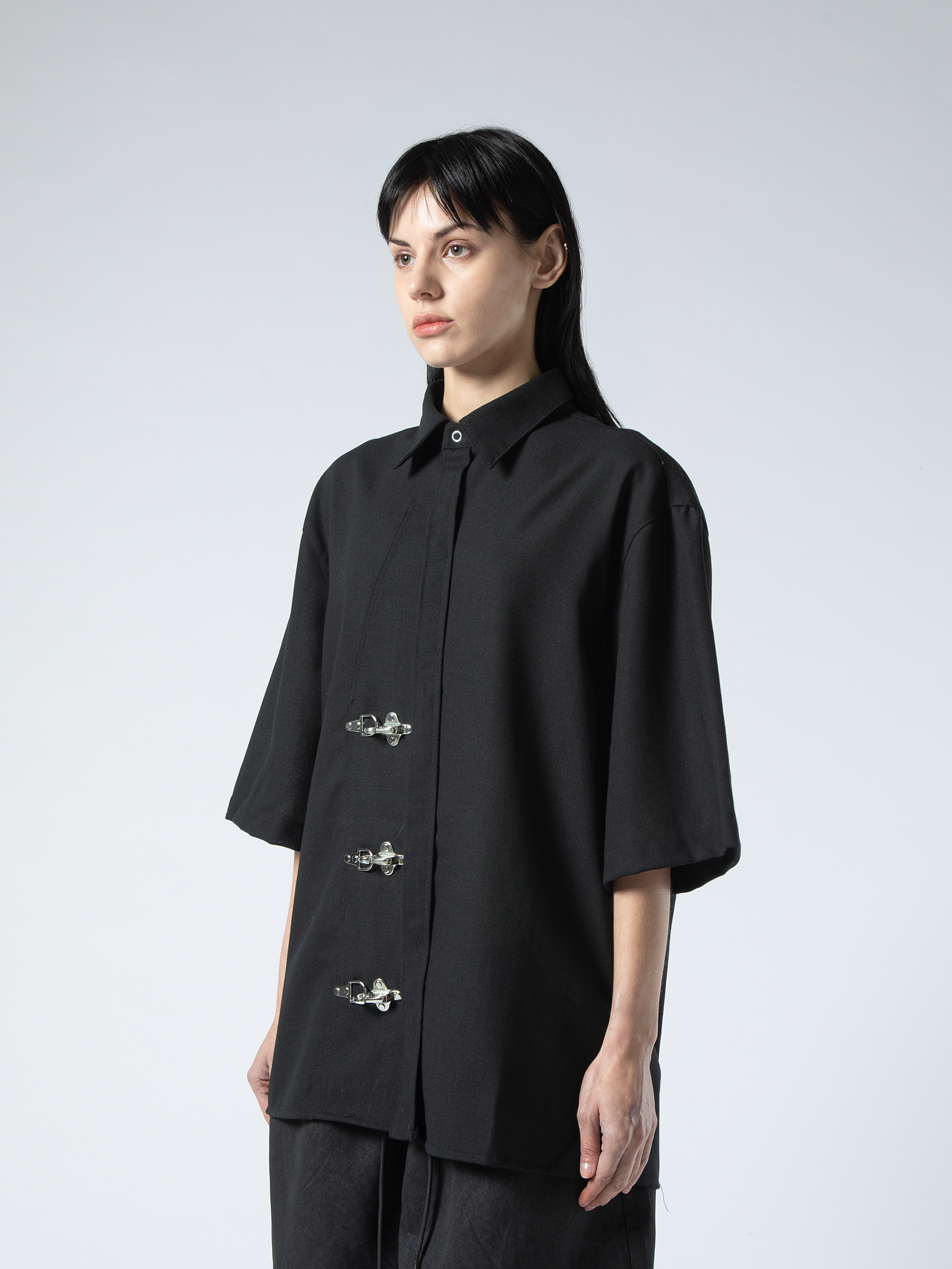 Short sleeve shirt crafted in lightweight cotton fabric, featuring a relaxed and boxy silhouette. Designed with a classic collar and distinctive front metal hook closures, the piece blends traditional shirting with a strong industrial accent. Clean lines and minimal construction highlight the contrast between the soft fabric and the hardware details. A statement shirt conceived to elevate contemporary looks with a sharp, utilitarian edge.