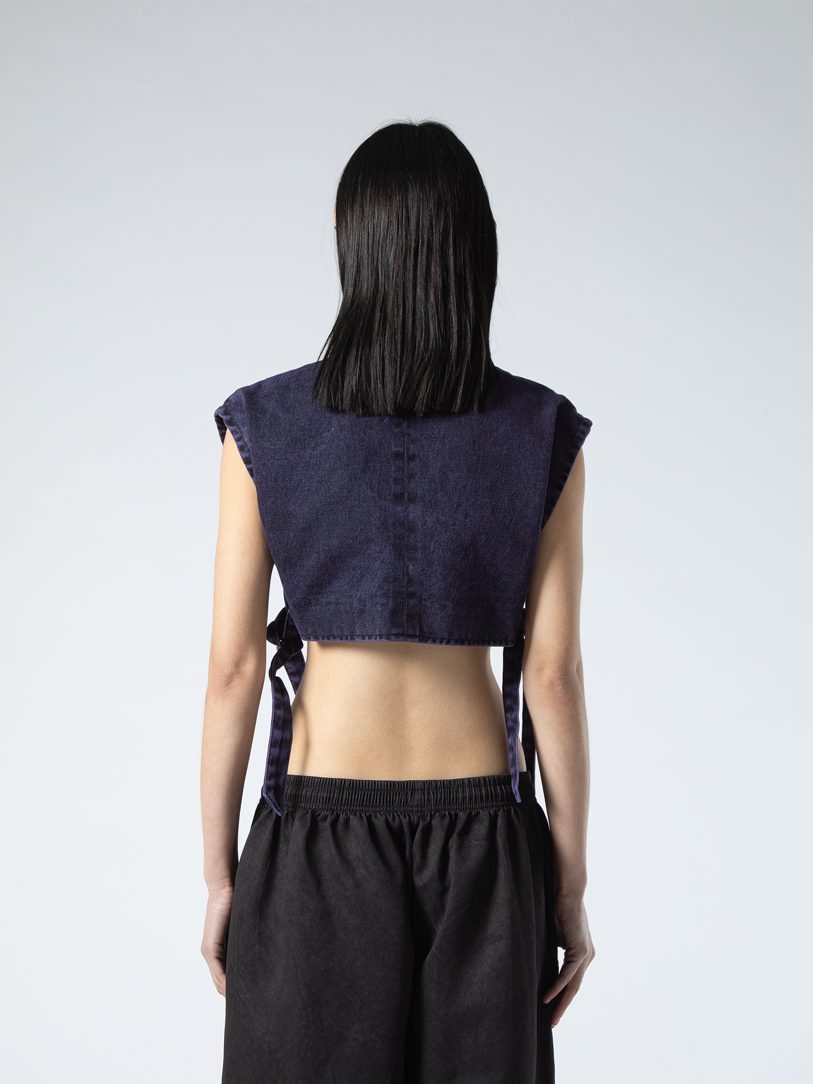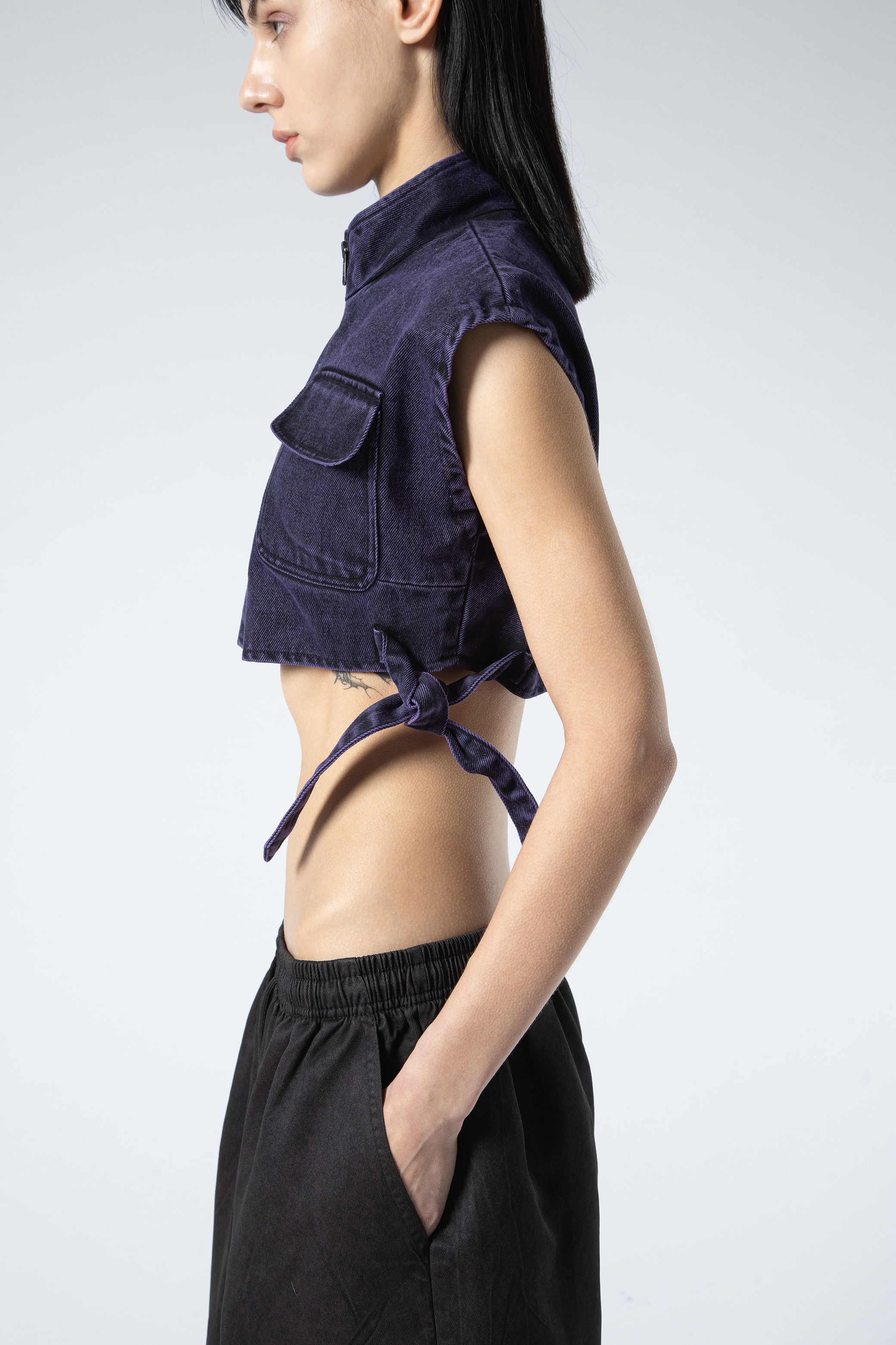 Cropped sleeveless vest crafted in cotton fabric, featuring a fitted silhouette with a high neckline and front zip closure. Designed with a single chest pocket and adjustable side ties, the piece combines utilitarian references with a sharp, body-focused cut. The garment is finished with a washed purple treatment that adds depth and a worn-in character. A statement piece conceived for bold, contemporary styling.