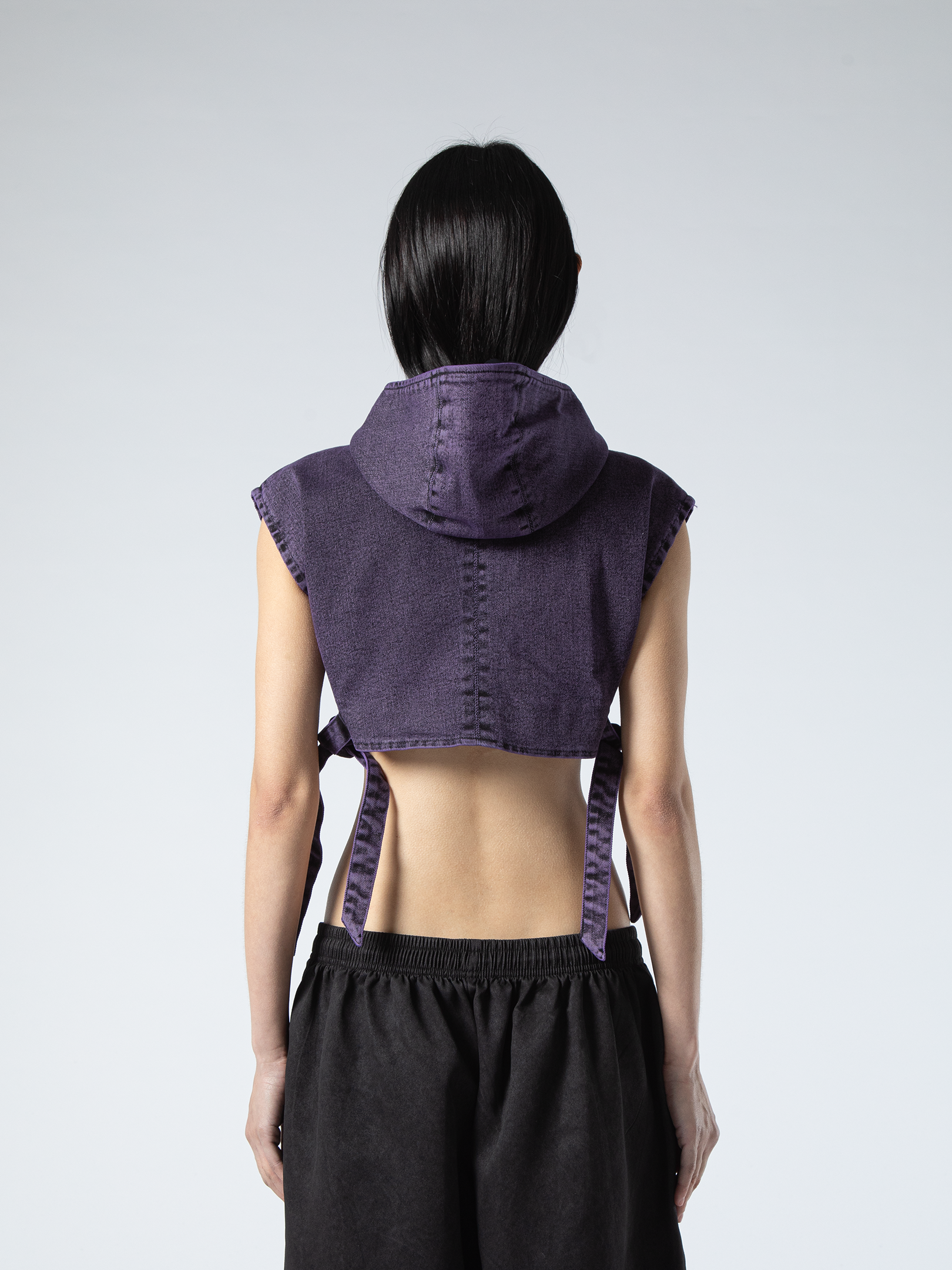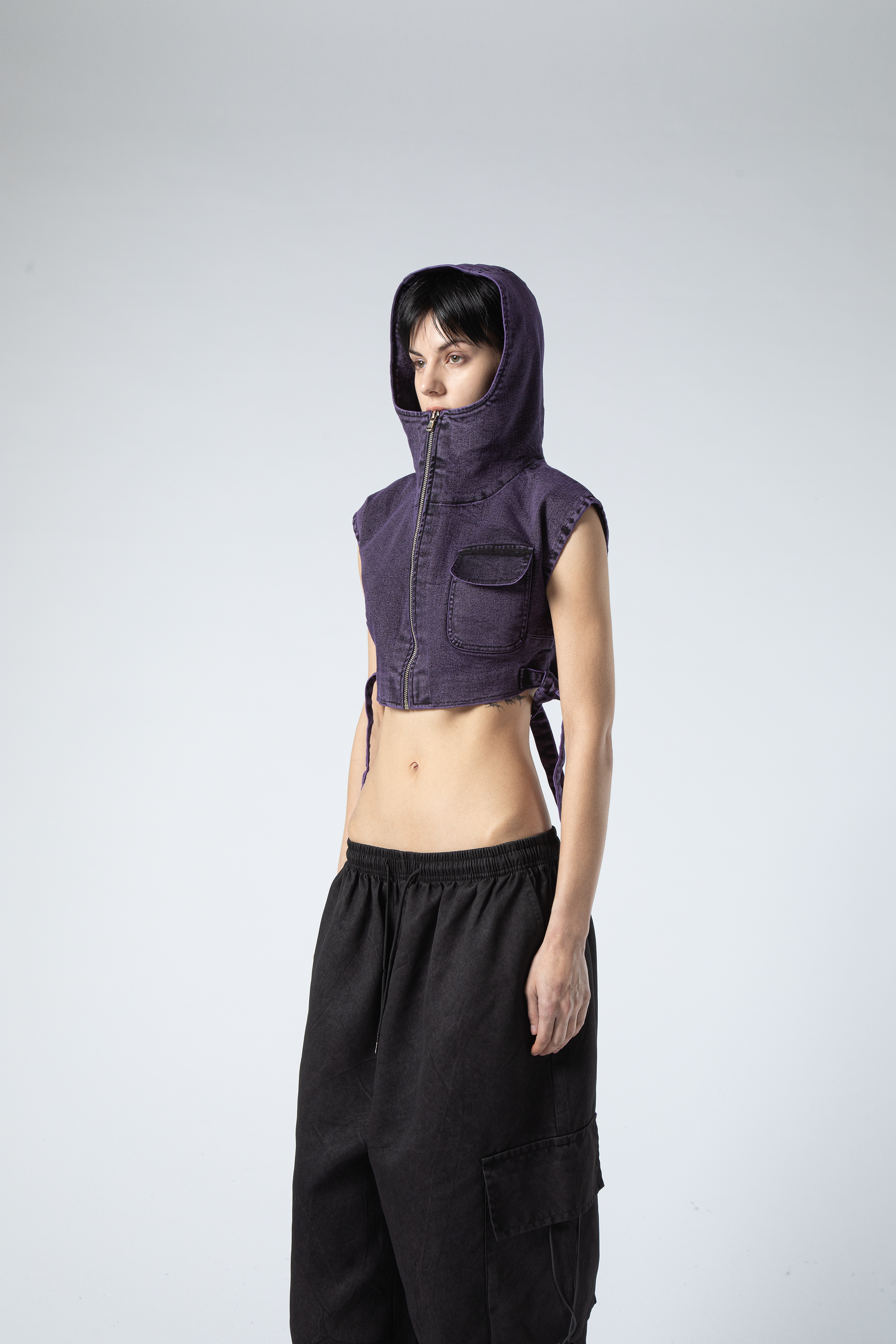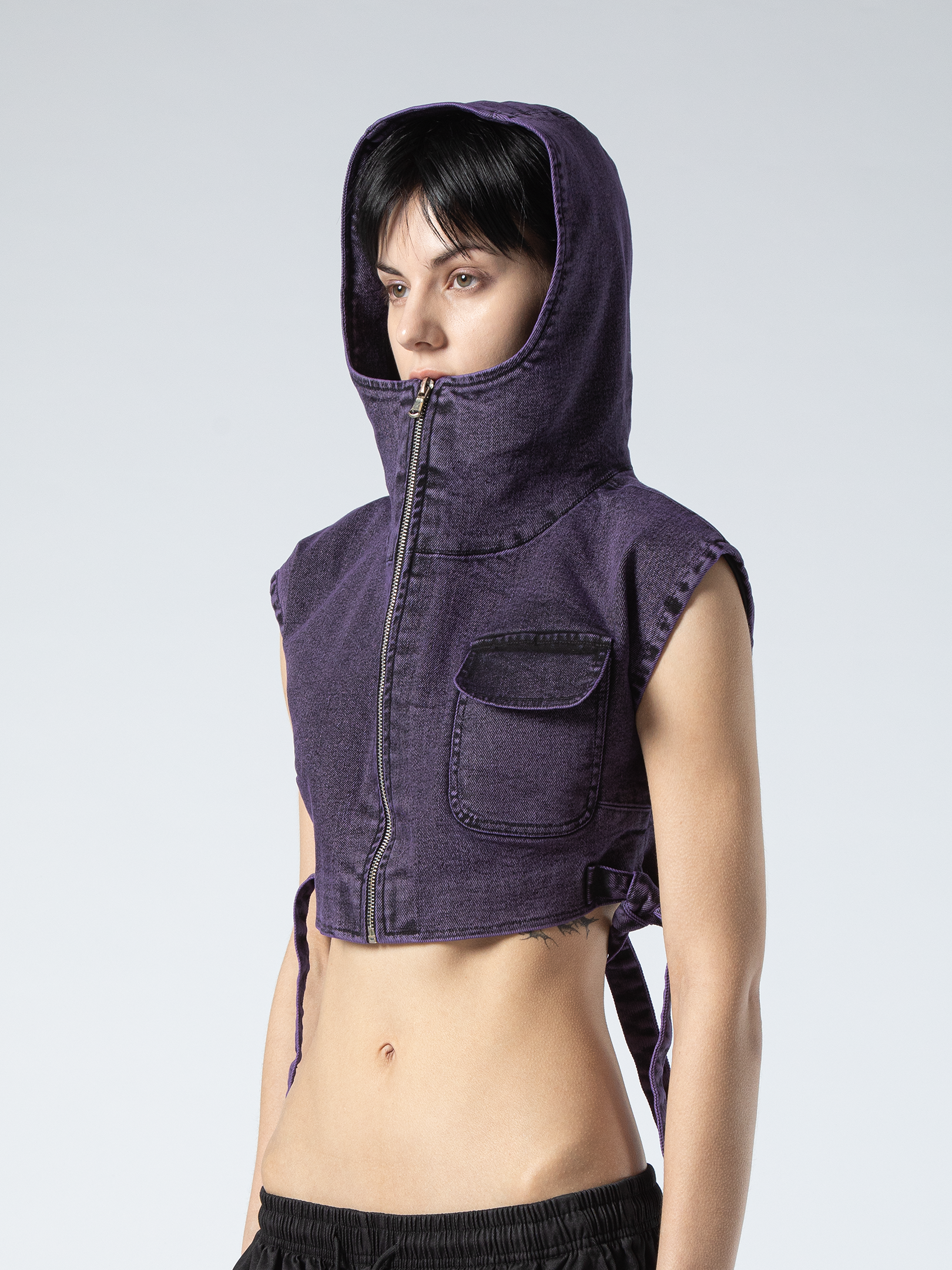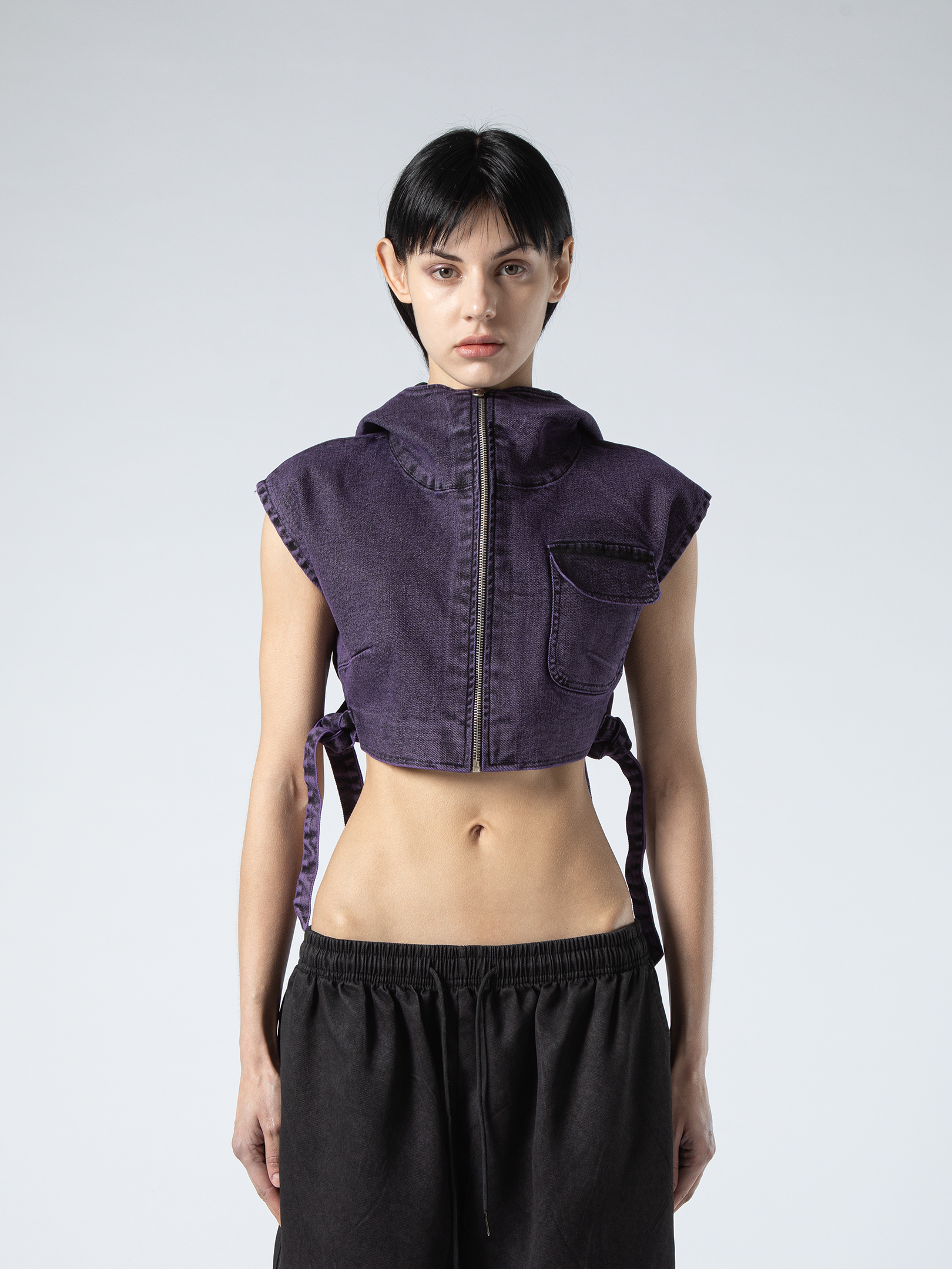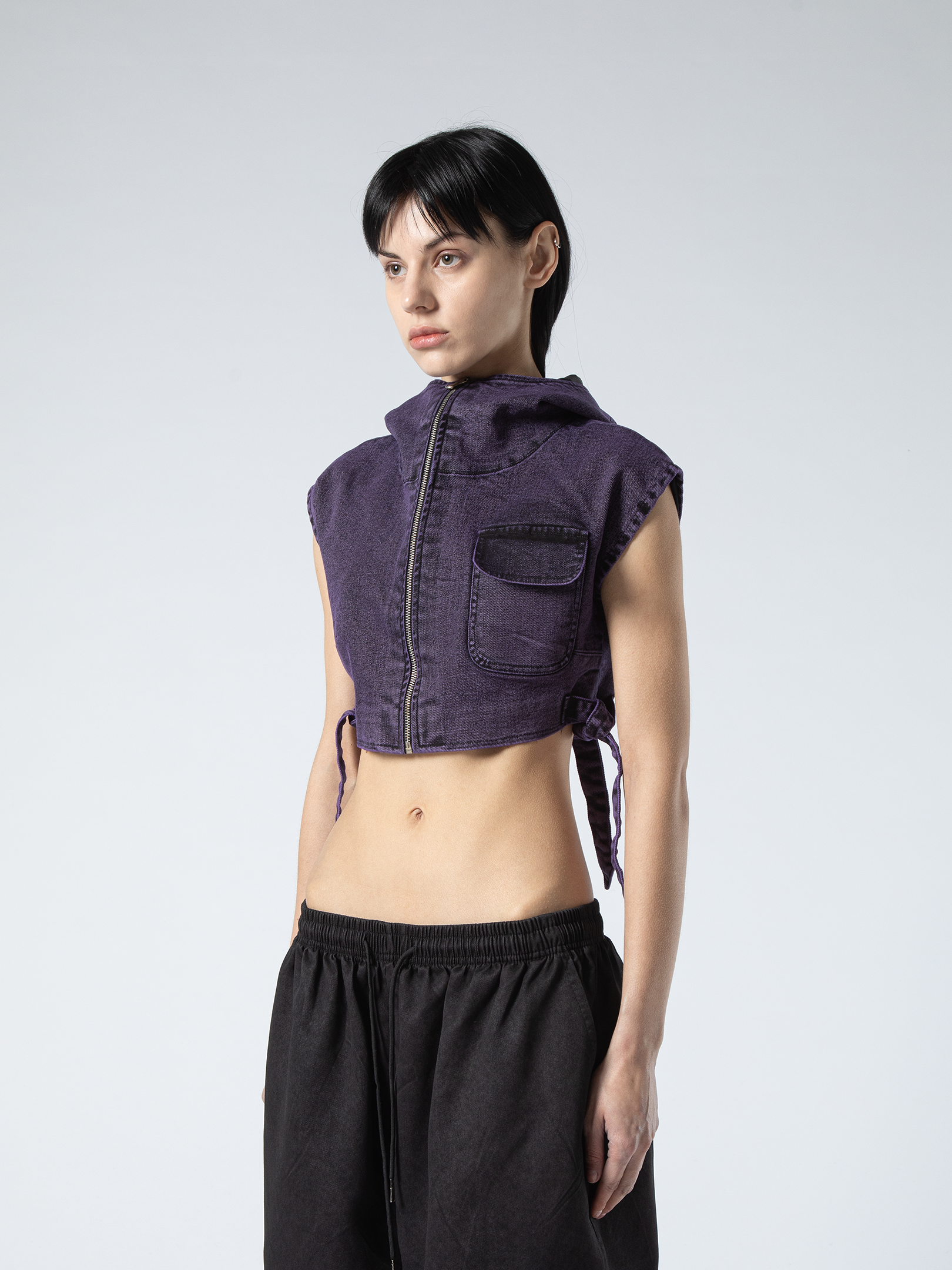 Cropped sleeveless vest crafted in cotton fabric, featuring a hooded design and front zip closure. The silhouette is compact and structured, enhanced by side ties that allow for adjustable fit and styling. A washed purple finish gives the garment a textured, lived-in appearance while maintaining a clean construction. A distinctive layer conceived to add attitude and dimension to modern looks.