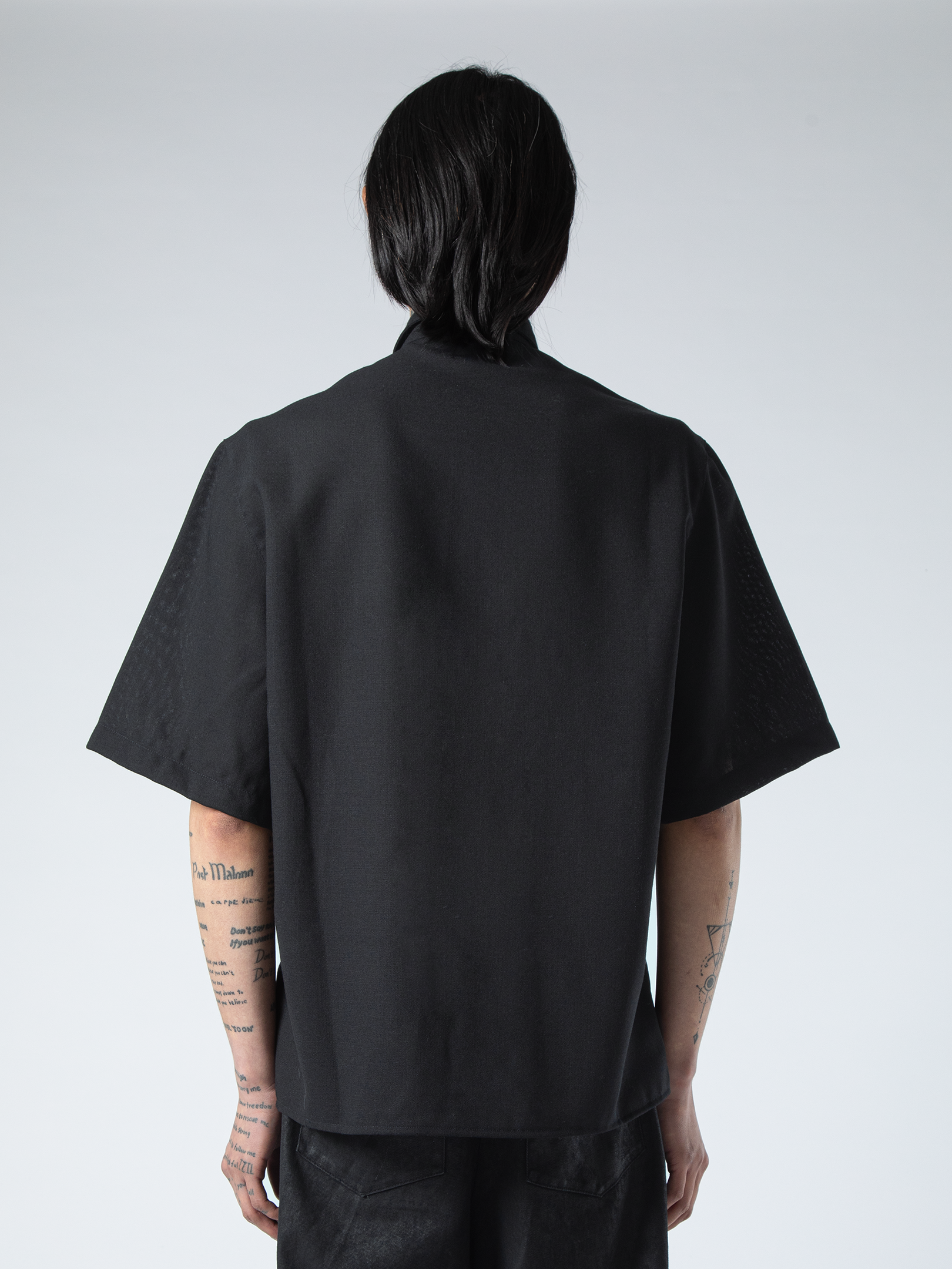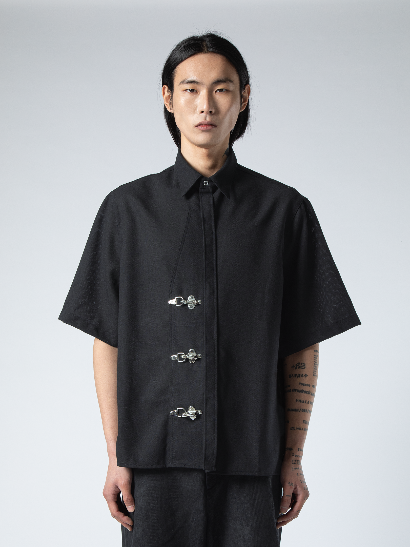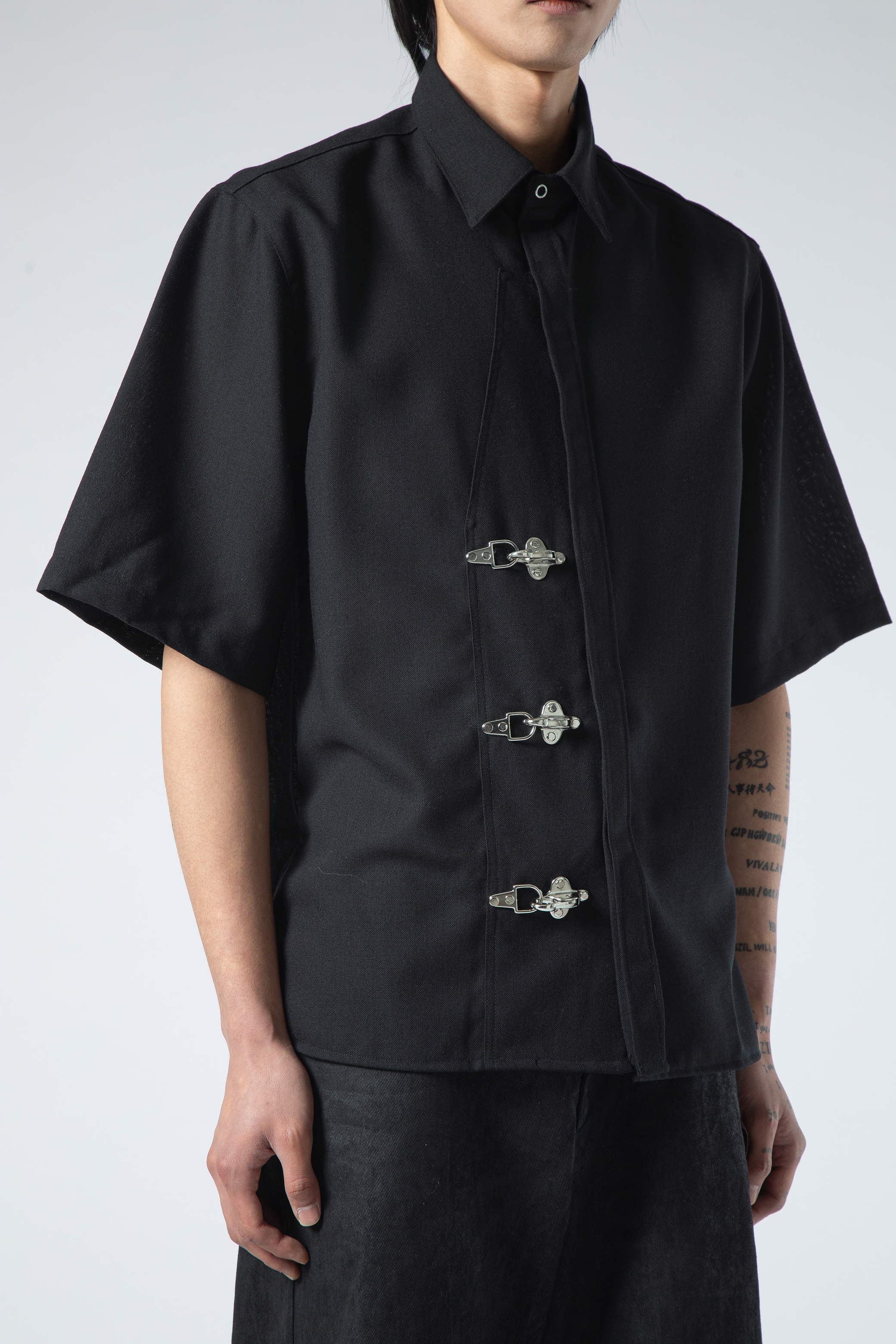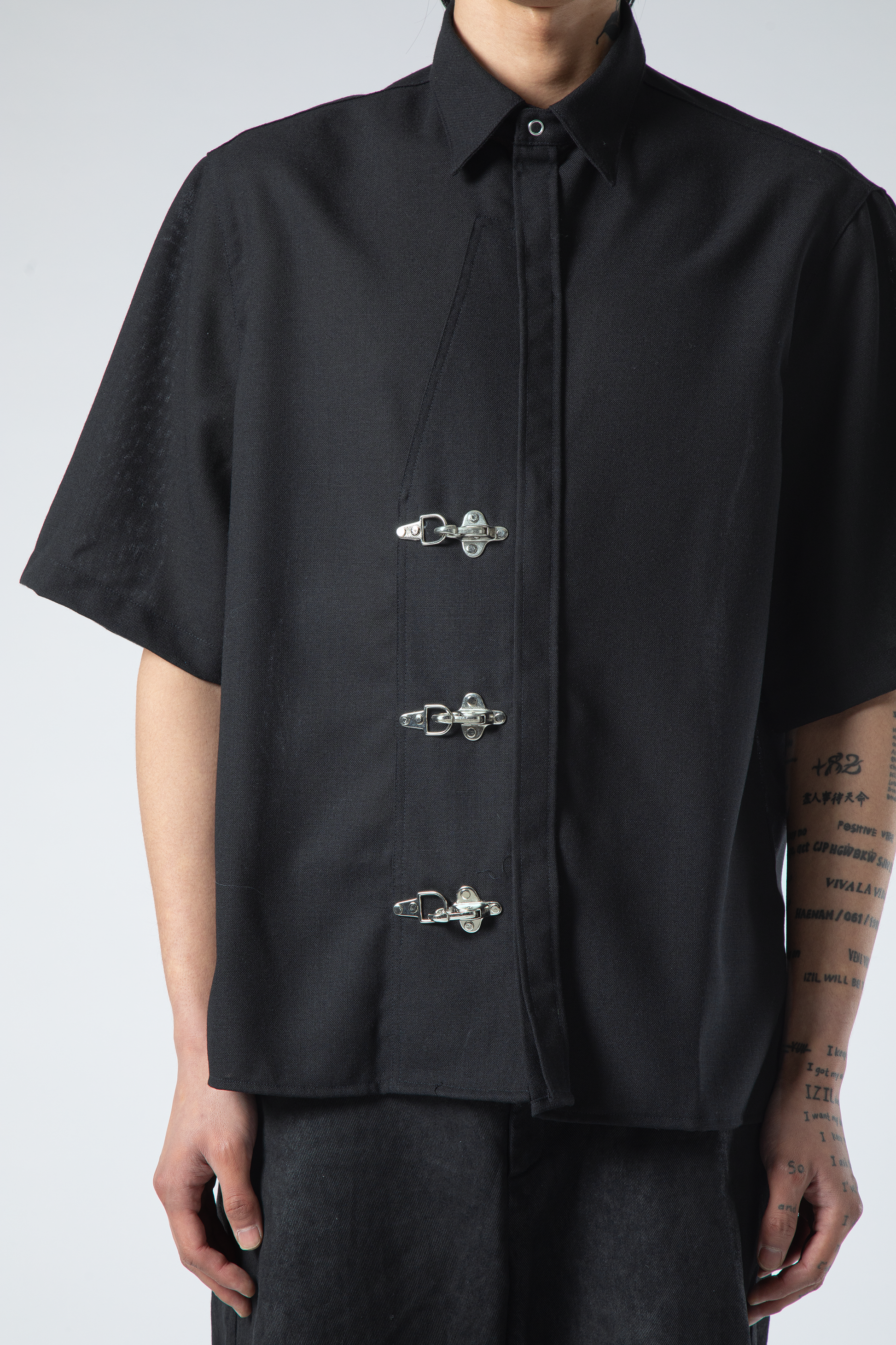 Short sleeve shirt crafted in lightweight cotton fabric, featuring a relaxed and boxy silhouette. Designed with a classic collar and distinctive front metal hook closures, the piece blends traditional shirting with a strong industrial accent. Clean lines and minimal construction highlight the contrast between the soft fabric and the hardware details. A statement shirt conceived to elevate contemporary looks with a sharp, utilitarian edge.