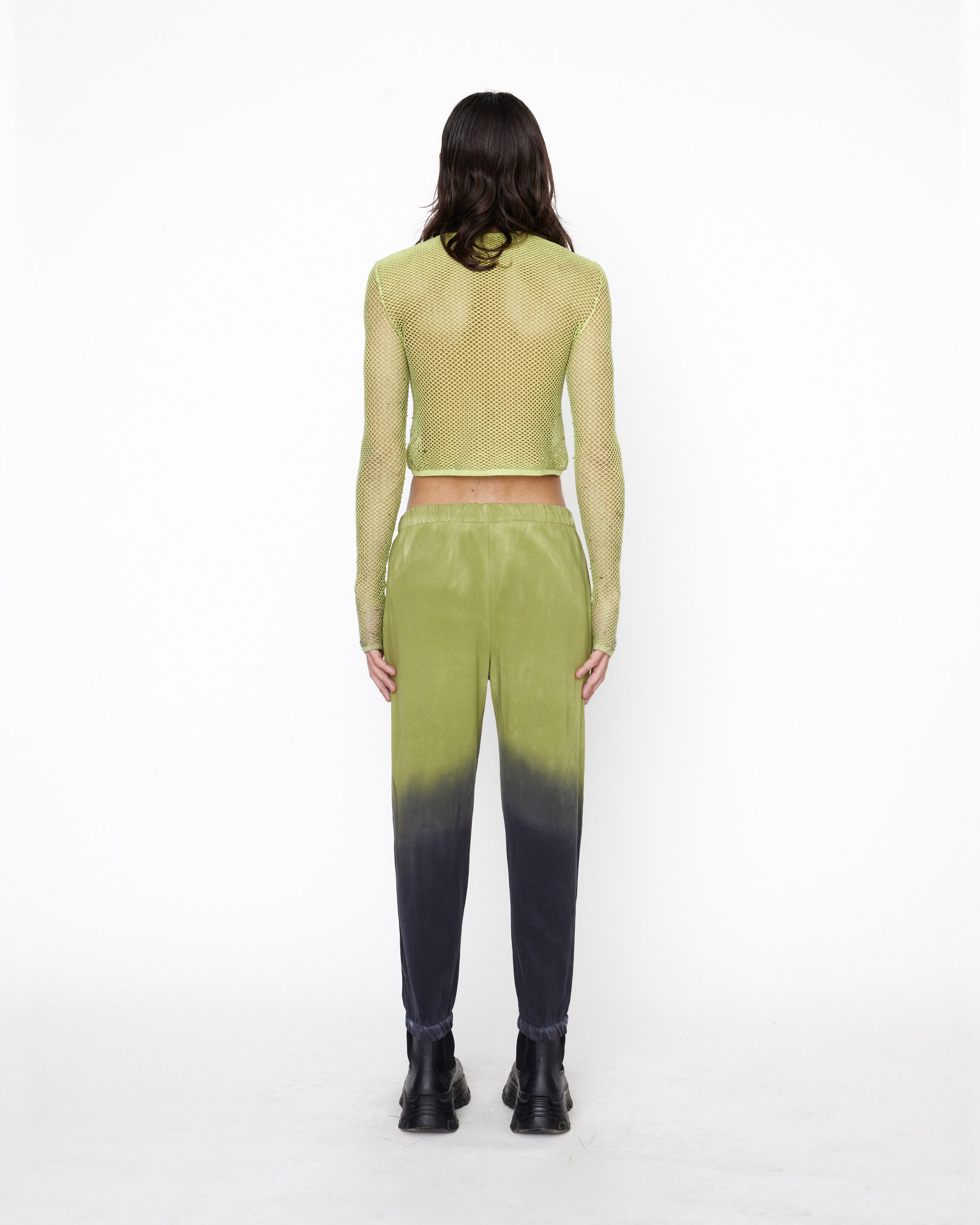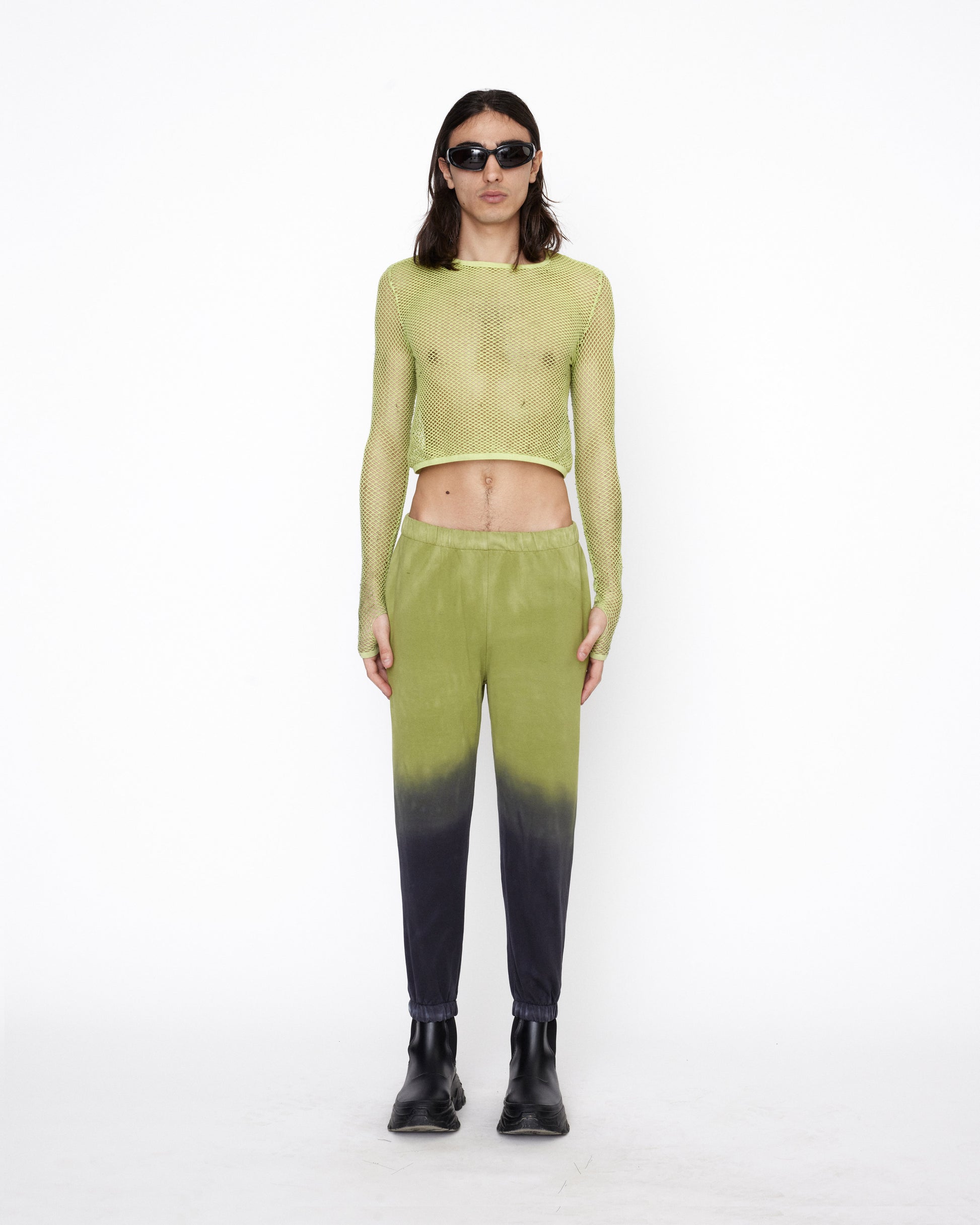 Luxury athleisure pants with elastic waist and elastic ankle. This item has been developed using an innovative washing technique to achieve a gradient shade transitioning from acid green into purple. The washing treatment has been carried out at our selected supplier in Veneto, Italy.