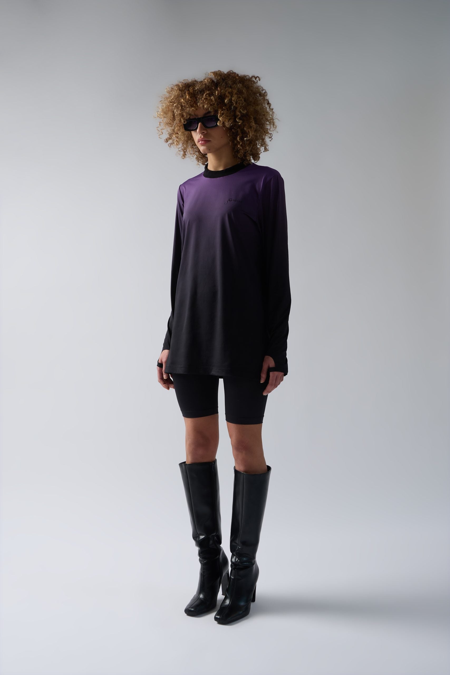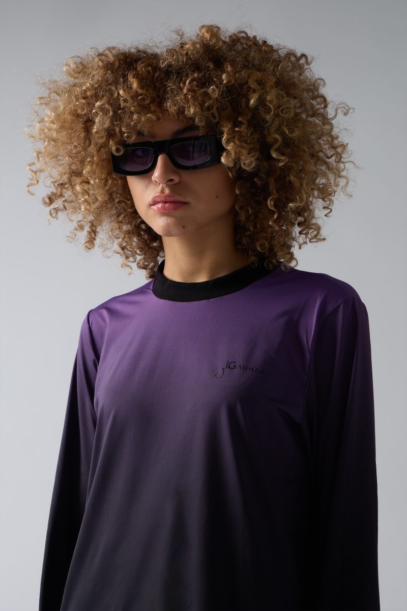 Gradient purple black acid long-sleeve shirt featuring the Gauhar Ali Official logo. This piece has been developed through an innovative treatment process to achieve a true gradient effect with smooth tonal transitions. Produced at our selected partners in Veneto, Italy.