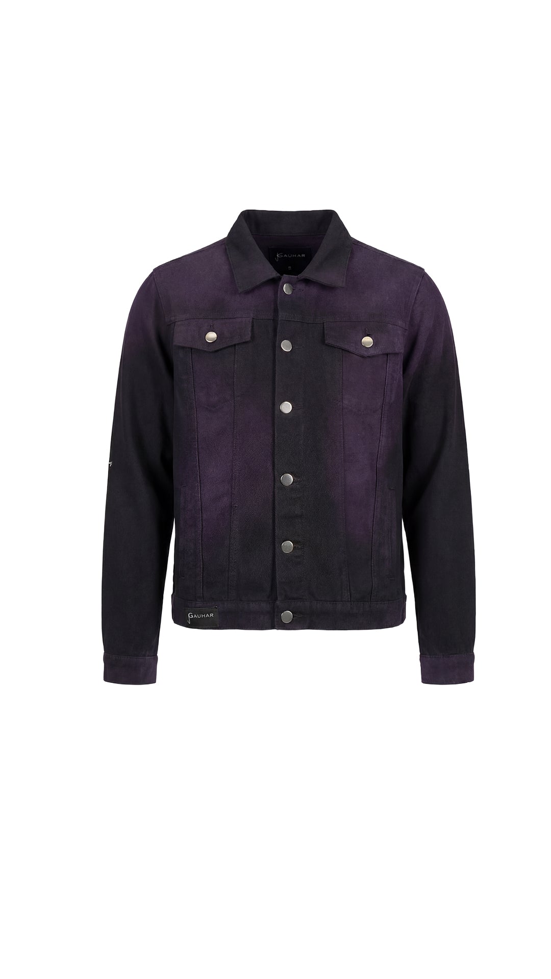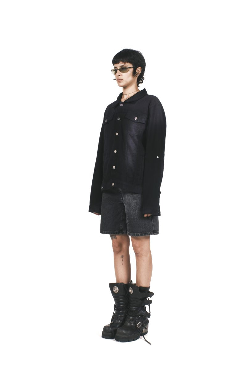 BLACK DENIM JACKET FEATURING STONE WASH AND PURPLE DERMATEX TECHNIQUES WITH METAL BUTTONS